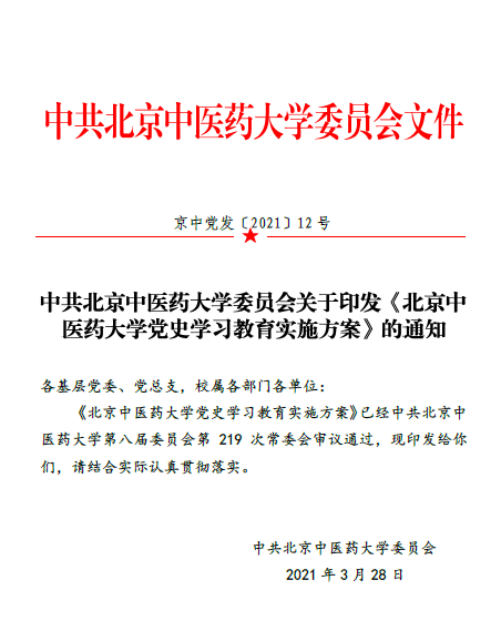 学校将党史学习教育与党委理论中心组学习紧密结合。在《北京中医药大学党委理论学习中心组2021年学习计划》中,明确列出党史学习专题。